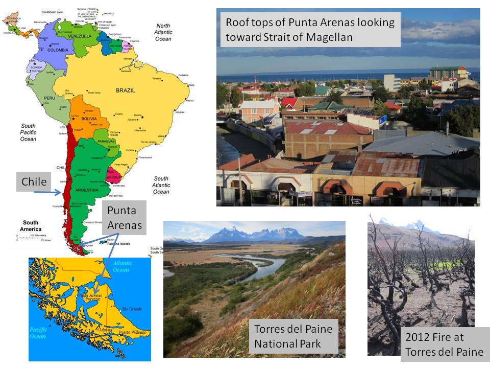 Chile is a fascinating place, especially far south Chile where I traveled a number of times. Punta Arenas (Sandy Point) is on the Strait of Magellan and is the southernmost city in the world (130,000 people). It is a popular jumping off point for tourists visiting Antarctica. About 1.5 hours north of Punta Arenas is one of Chile’s premier national parks called Torres del Paine (photo). In January 2012 an Israeli tourist set off a major fire from his camp (accidentally) that burned about a third of the park. The fire was similar in extent to the 1988 Yellowstone National Park fire. I visited Torres del Paine a week after the fire with park officials and Chilean reforestation experts to discuss recovery options. I will visit the park this May (2013) along with others, including an Israeli forestry official to study the extent of natural recovery and plan necessary remediation efforts. Very interesting stuff!!!