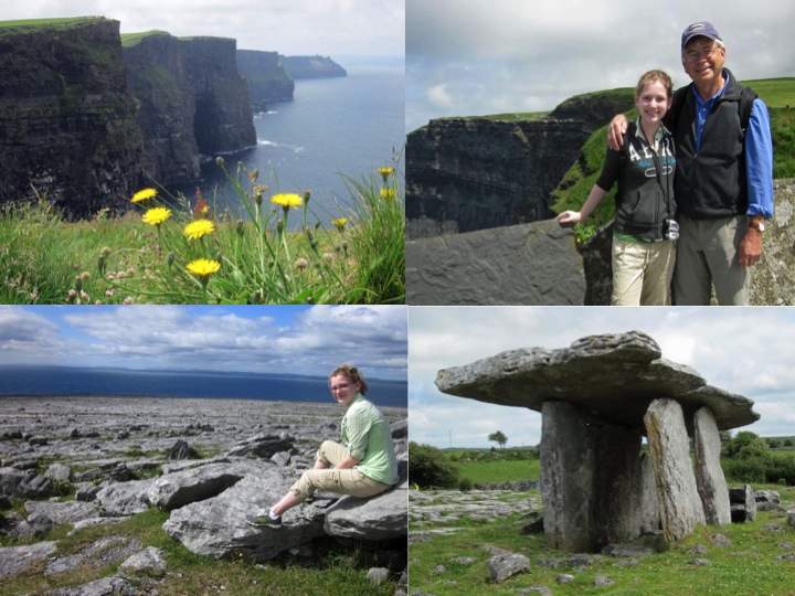 The Cliffs of Moher (photo) is one of Ireland’s most remarkable natural features. The limestone plateau of the Burren range plunges 1000 feet into the sea. They stretch for 5 miles along the cost of Clare. The nearest village is Doolin, the traditional Irish music capital of County Clare. And Ballyvaughan, just around Black Head Mountain, is a fishing village dotted with slate-roofed cottages. The whole area is referred to The Burren, a massive plateau covered with huge flagstones called clints (photo) broken by deep fissures through which millennia of rainfall have drained to form underground caves and rivers. An early surveyor declared it a savage land, yielding little. In fact, it is astonishingly rich in plant life, and abounds in stone forts and megalithic tombs dating back 3500 BC (photo). It was a good day.