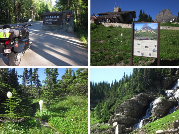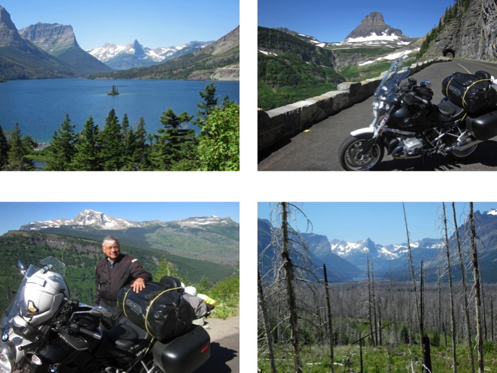 Heading up Going to the Sun Road a sign warned: No Center Stripe on Road. And above the sign I could see the road cantilevered around a shear cliff with a 2-foot, stone guardrail. Carol, very acrophobic, would hate this, I thought. By now she should be used to it given that I have tortured her on these types of roads in several places in the world. I must admit that looking over that 2 foot wall into space at 20 mph from my high and open perch on Boxxer gave me the heebie-jeebies for a moment.