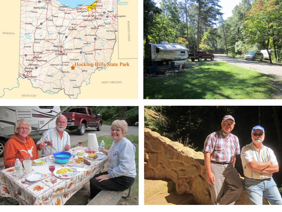 After a 4 hour trip heading east, Ted and Carol arrived, and after a 6 hour trip heading north, Carol and I arrived—within minutes of each other. I can only attribute the close coordination to Burger ESP. From the water hydrant where we filled our fresh water tanks, we drove together to the campground and found nice, isolated sites across from each other (photo), on a gorgeous September day, at a pretty place called Hocking Hills State Park.