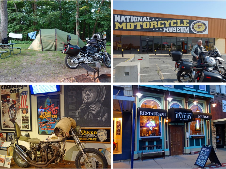 1. Campsite near Anamosa, IA: 2. My riding buddy Jeff in front of the National Motorcycle Museum; 3. Steve McQueen’s Indian Scout; 4. Tyler & Downings on Main Street Anamosa.