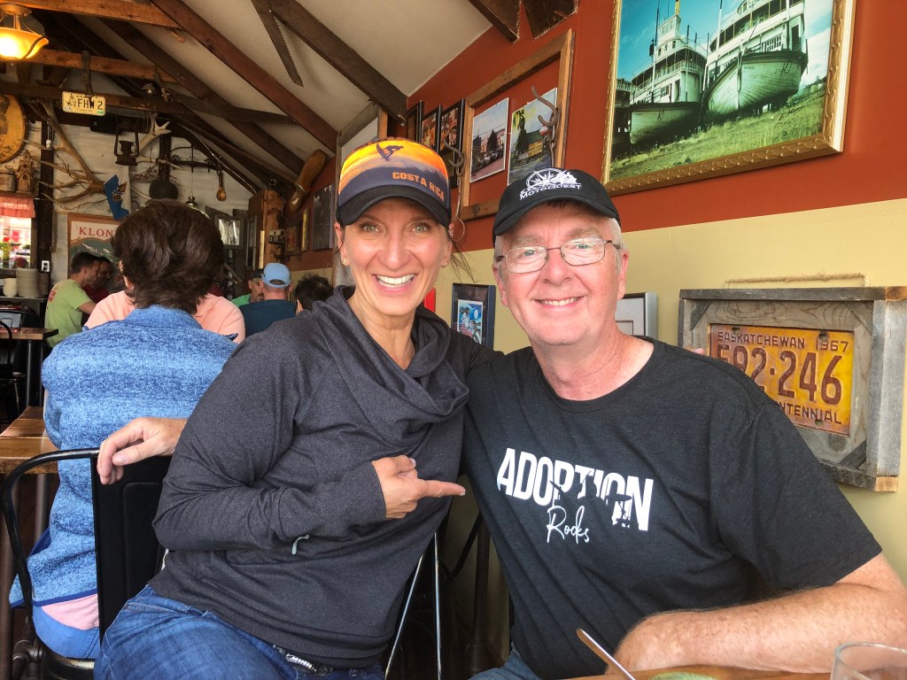 We were well into our lunch of Heavenly Halibut Chowder, and Halibut Fish & Chips when Donna exclaimed: “So you are the good looking guys Jason told me about! I had to run some errands so I just got in, but I spotted you guys right away!” she said with convincing zeal. Donna was a real hoot. She was from the States originally but moved to Whitehorse years ago. She seemed genuinely interested in each of us but was especially keen on Don because of his shirt: she wanted it. Don’s tee-shirt, a gift from his daughter who has several adopted children, was inscribed: “ADOPTION Rocks”. It seems Donna was adopted as a young child. After the trip, Don sent her the shirt.