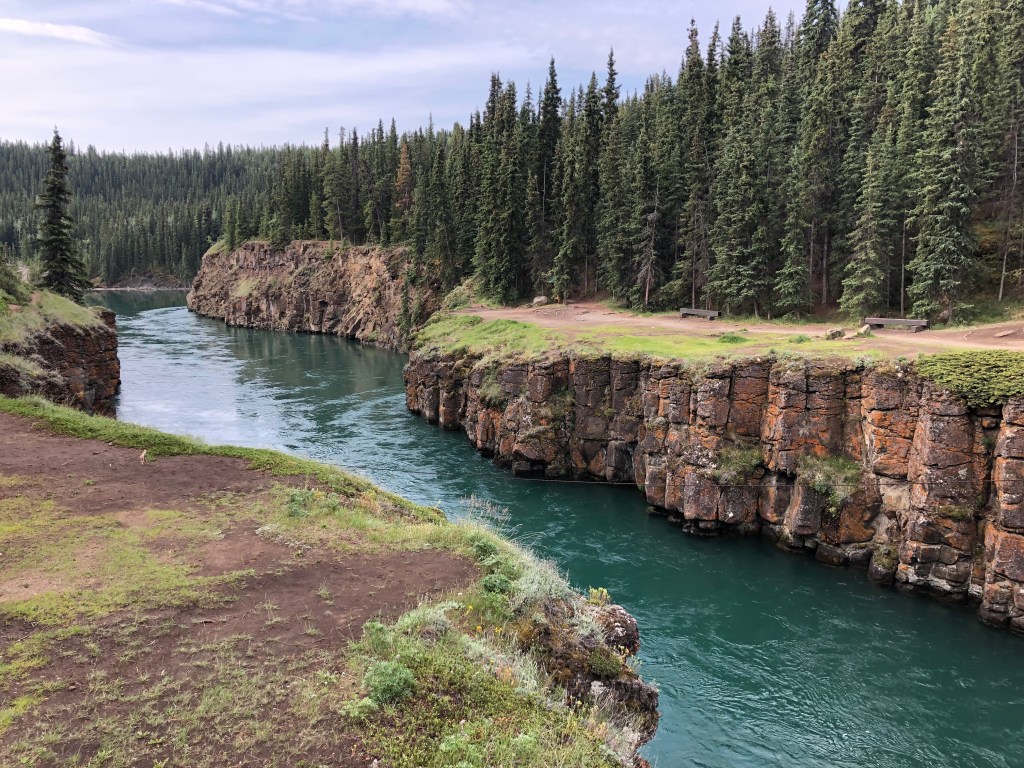 While Richard hung with the Apple techs who fixed his phone, Don and I took a tour of the S. S. Klondike, one of the few surviving Yukon steamboats, now a museum piece. We also hiked over the Yukon River pedestrian suspension bridge above the basalt cliffs of Miles Canyon where the Yukon cut through an ancient lava flow. Now with new tires, “new” iPhone, and some great experiences, we reluctantly departed the Robert Service Campground on the south of Whitehorse and headed north on the famous Klondike Highway toward Dawson City.