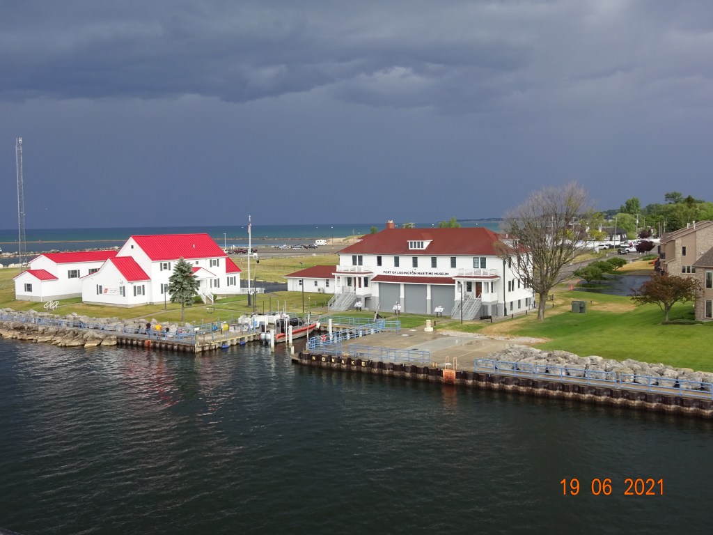 Departing Ludington on the SS Badger with an ominous sky. Storm clouds were all around us. The deckhands interrupted their routine of loading cars first on the ferry. Just before a downpour, they got all us motorcyclists and our bikes loaded before getting soaked. We saw it coming. We worried. But the SS Badger sailors got us on. Just before it rained—hard.