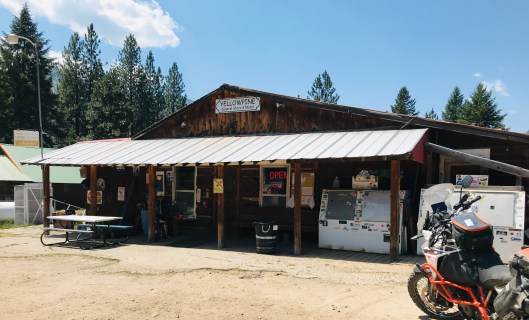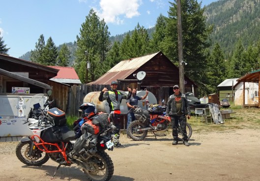 Eight hundred milligrams of ibuprofen along with my breakfast oatmeal and coffee got me on my feet and on my bike. We motored up and over Elk Summit without issue and rolled into Yellow Pine early afternoon. Josh, proprietor of Yellow Pine General Store gassed up our bikes and offered us a room in the back of the store. I iced my ankle then Jeff and I had a late lunch with David and William (photo), a father and son team heading north on the trail; we were headed south.