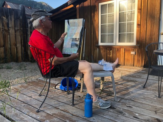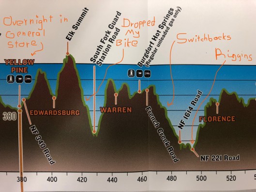 I brought my blue collapsible bucket along to wash down my bike from time to time. But now it was most useful for soaking my swollen foot. We camped for the night on the trail next to Elk Creek. My condition in the morning would determine our next move. As the profile map shows, it was a half-day ride to Yellow Pine for gas, ice for my ankle, and any other services. But Elk Mountain was in the way. “Attitude is the difference between an ordeal and an adventure.”