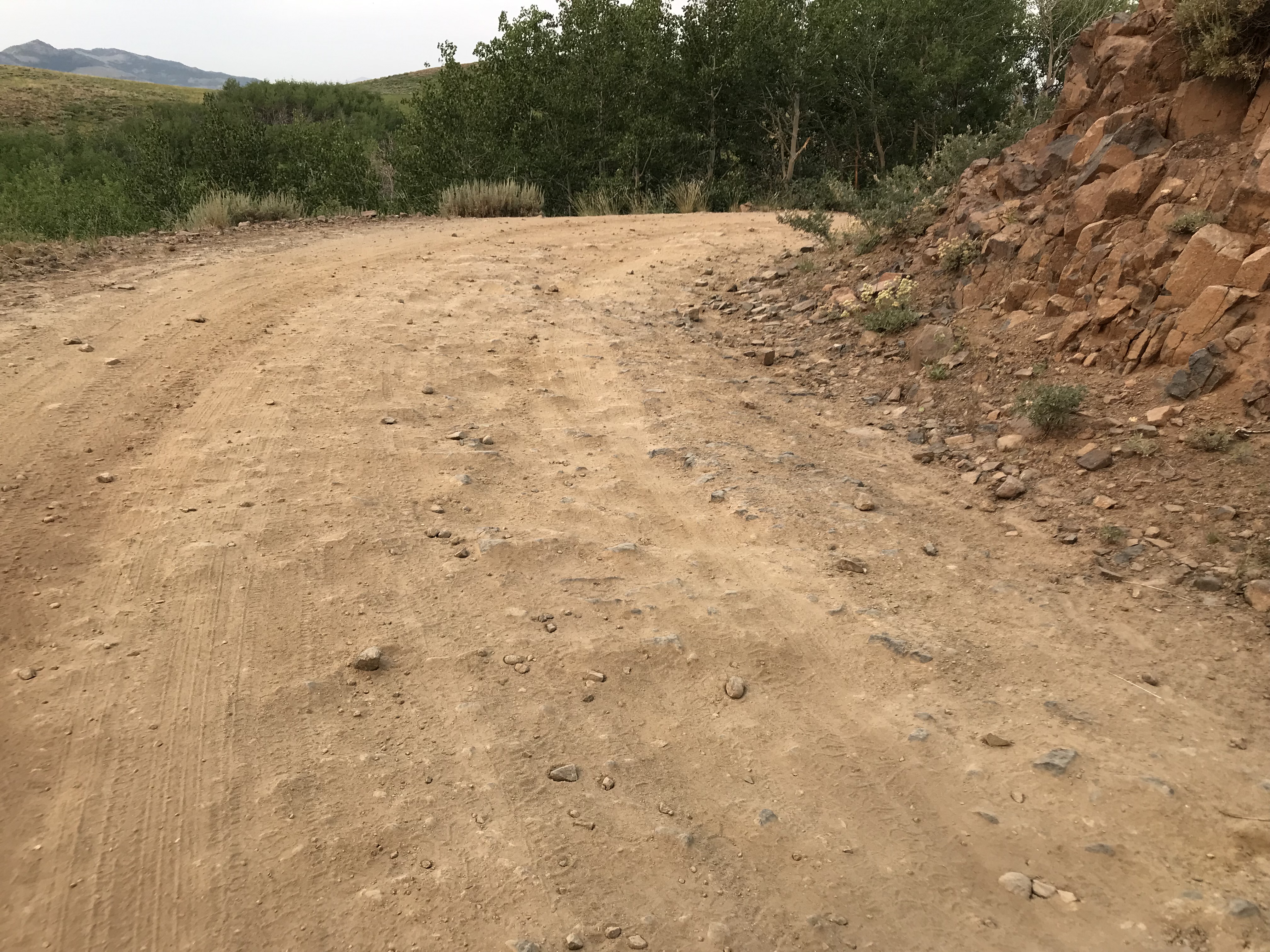 We enjoyed meeting James at the Outdoor Inn. He was an old guy (actually, at 72, several years younger than I, so not so old) riding a Suzuki DR650, a popular bike on the BDR. He had hauled his bike on his truck from Texas to the top of the BDR at the Canadian border, parked his truck, rode highways down to Jarbidge, and would meet his two sons here the next day to begin the trail north to Canada. His boys also rode DR650s. Several days later there was a post on the IDBDR Facebook page that a rider of a DR650, part of a father and son threesome, broke an ankle causing them to abort their trip. So, there’s that. Another factor limiting completion. It seems this trail is hard on ankles.