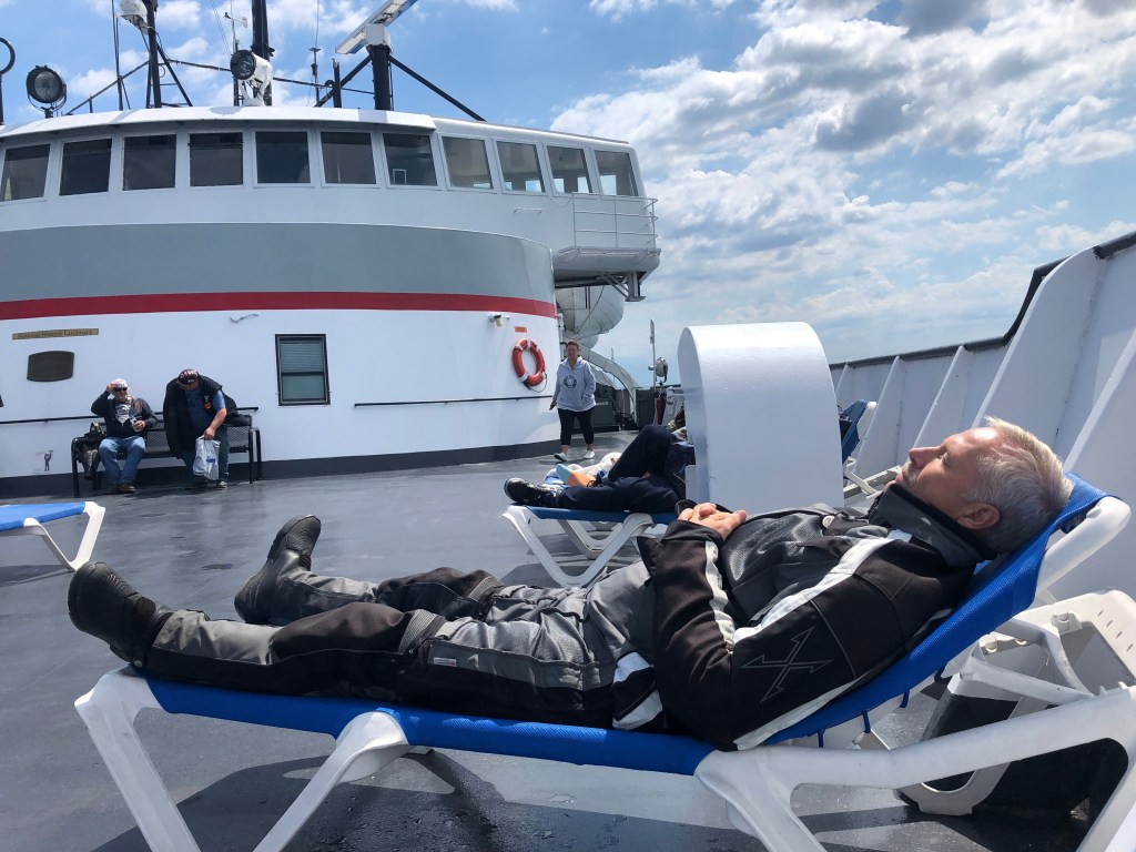 The rain stopped. The sky cleared. Jeff found a comfortable spot on the deck for the remaining two-hour sail across Lake Michigan. We would need the rest; a long ride awaited us on the other side.