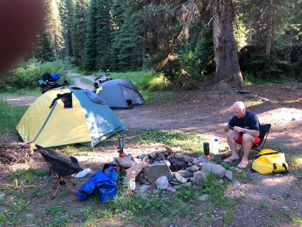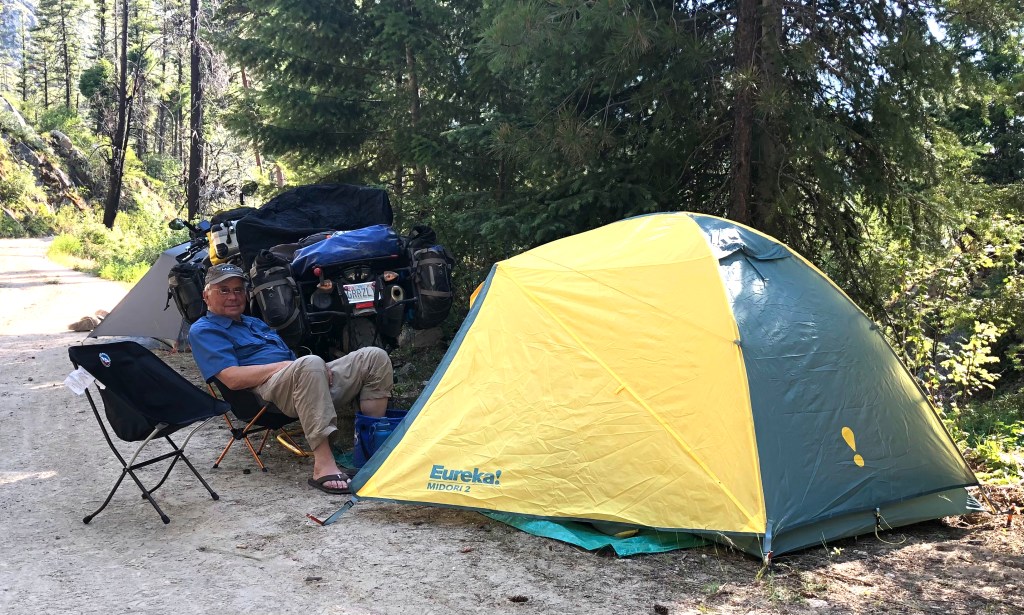 Most riders begin the Idaho BDR in Jabidge, NV, and go north to the Canadian border. Already in Great Falls MT at the BMW rally, Jeff and I were only a day’s ride from the north end of the trail at Port Hill, ID, so we chose to do the route “backward” from north to south. This coincidence turned out to be fortuitous. As we traveled south, wildfires were erupting behind us shutting down parts of the trail we had just traversed. Here we are 30 miles from the start of the trail camped at Twin Rivers Canyon Campground at the confluence of the Kootenai and Moyie Rivers, not far from Bonners Ferry, ID. A short ride in the morning would put us at the start of the Idaho BDR.