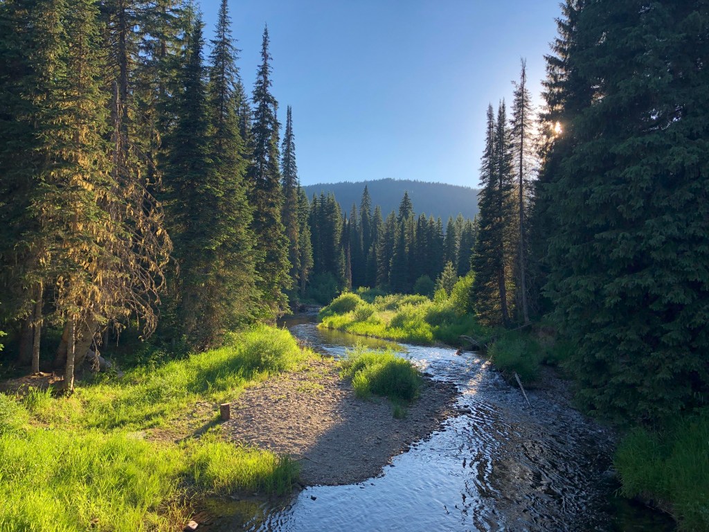 The track on the first day mostly consisted of flat roads along the Kootenai River which allowed me to rally my off-road aptitude on the slippery, round river gravels. The final 40 miles of our first 120-mile day turned into an isolated, steep, dirt track. We saw nary a vehicle or soul that afternoon or night as we camped next to a bridge across the headwaters of the Coeur D’ Alene River (photo). The water was cold, but a bath in the stream was necessary and refreshing.
