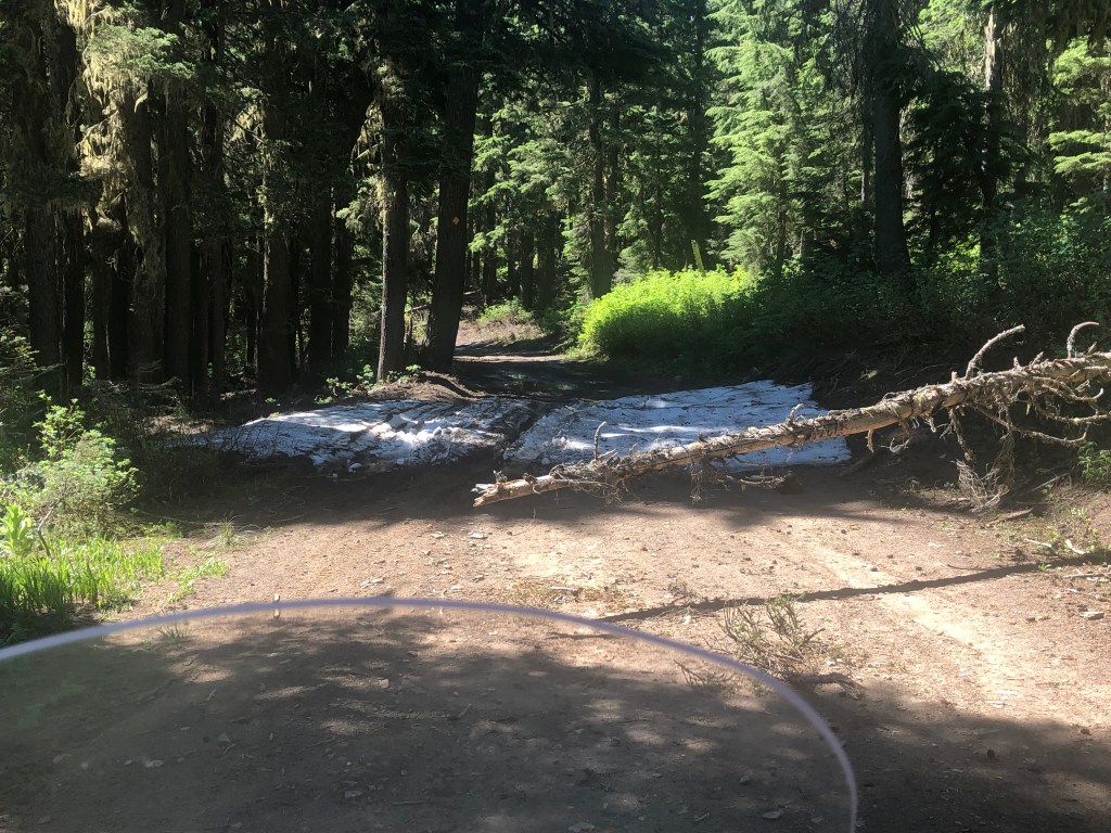 We encountered snow in the shadows at high elevations along the trail, but deadfall across the road was a far greater problem. July through September is considered the window for traveling the IDBDR. We began on the north end the last week of June and worried that deep snow in the mountain passes would shut us down. However, the intense heatwave throughout the Northwest caused early snowmelt which allowed reaching the highest points of the trail. That is until massive, uncleared deadfall brought us to a dead stop on the old Lolo Trail.