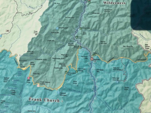 The Magruder Corridor is a primitive east to west trail bisecting the Selway Bitterroot and Frank Church-River of No Return Wilderness areas. We began the route on the east end over the Nez Perce Pass past a sign that warned: No services for 113 miles. Axe, shovel, and bucket essential at all times.” We had no axe or shovel, just a bow saw and a collapsable, plastic bucket. I assume the shovel might be needed to dig out a stuck wheel, but the bucket requirement was a mystery—what do you think?