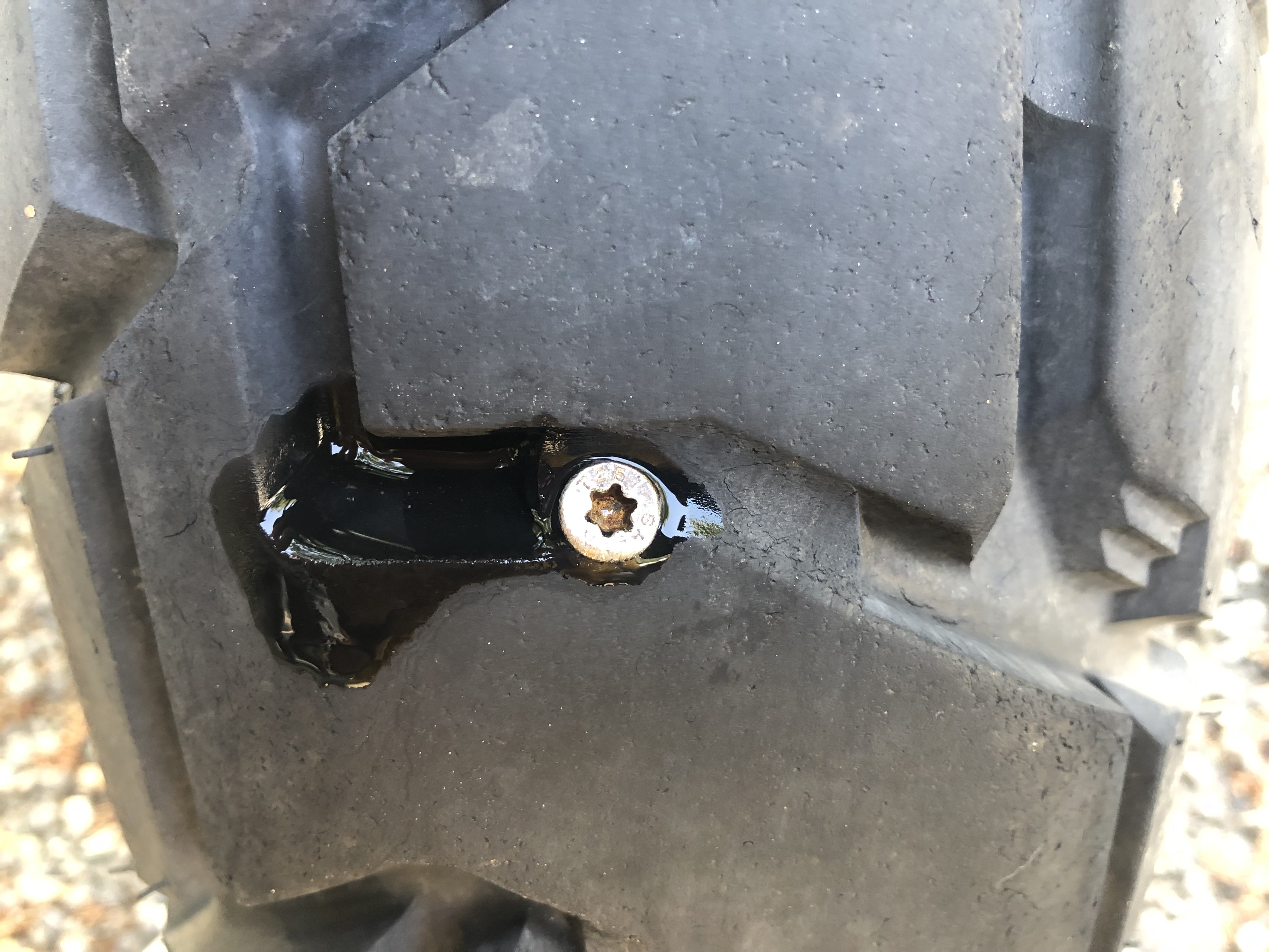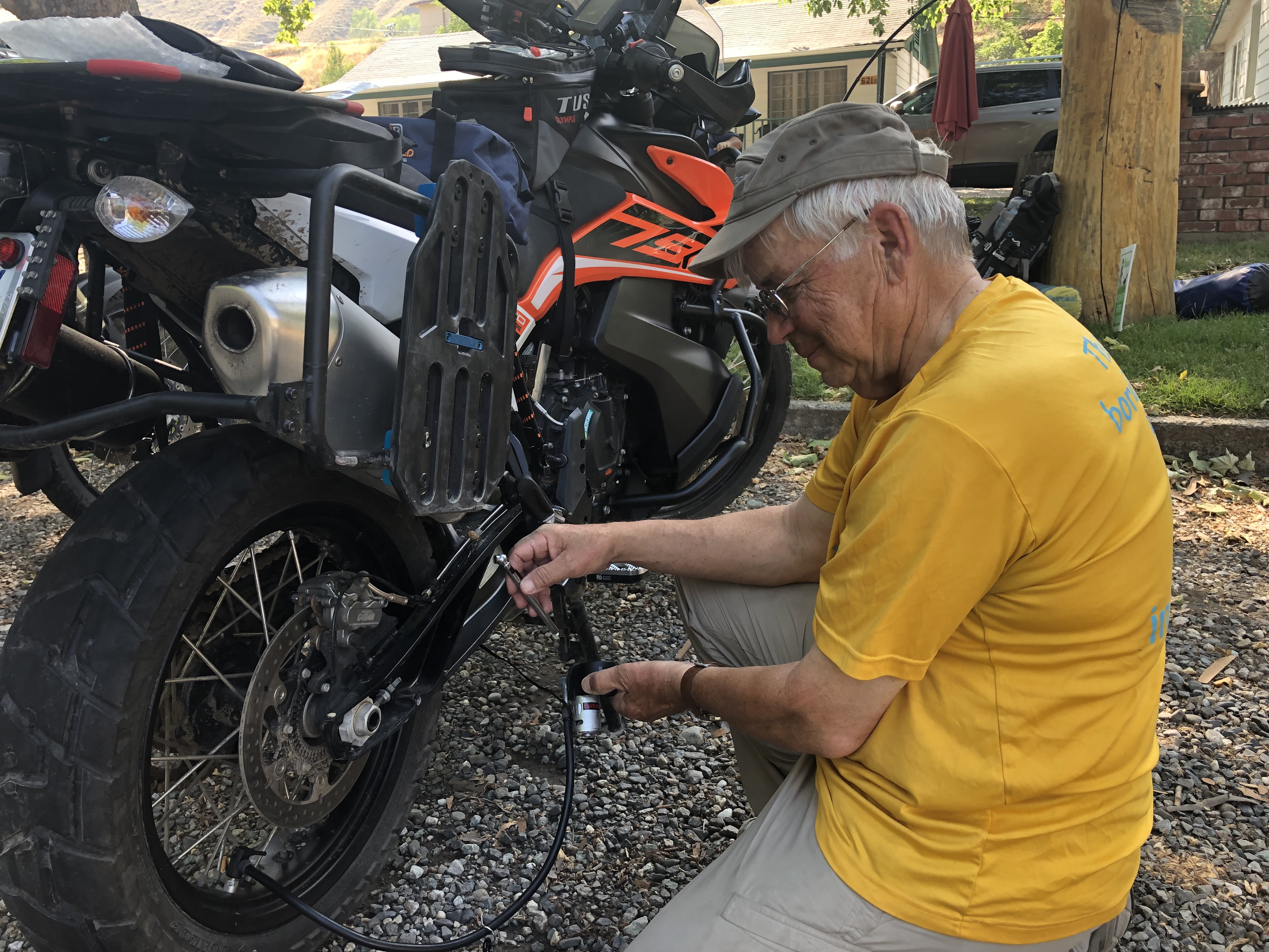 Still quite alert after a couple of beers, Jeff, while oiling the chains of both bikes, found a deck screw embedded squarely in the center of my rear tire (photo). A drop of water on the head of the screw confirmed that I had a slow leak. I’m lucky he found it, and lucky we were off the trail before I lost a lot of air. Thirty minutes later we had the screw removed, the hole plugged with the mushroom plug kit I carry, and had the tire pumped back to the required 35 psi. The patch held for another 3,000 miles. That’s the beauty of tubeless tires, they are easy to repair without removing the wheel or the tire if the hole is not too large.