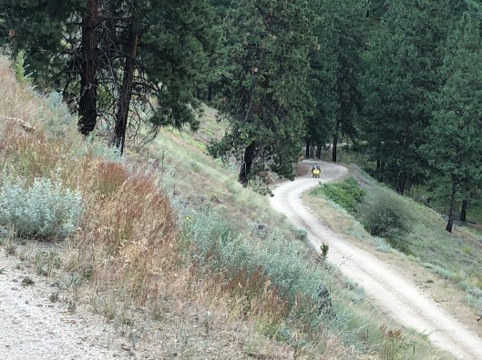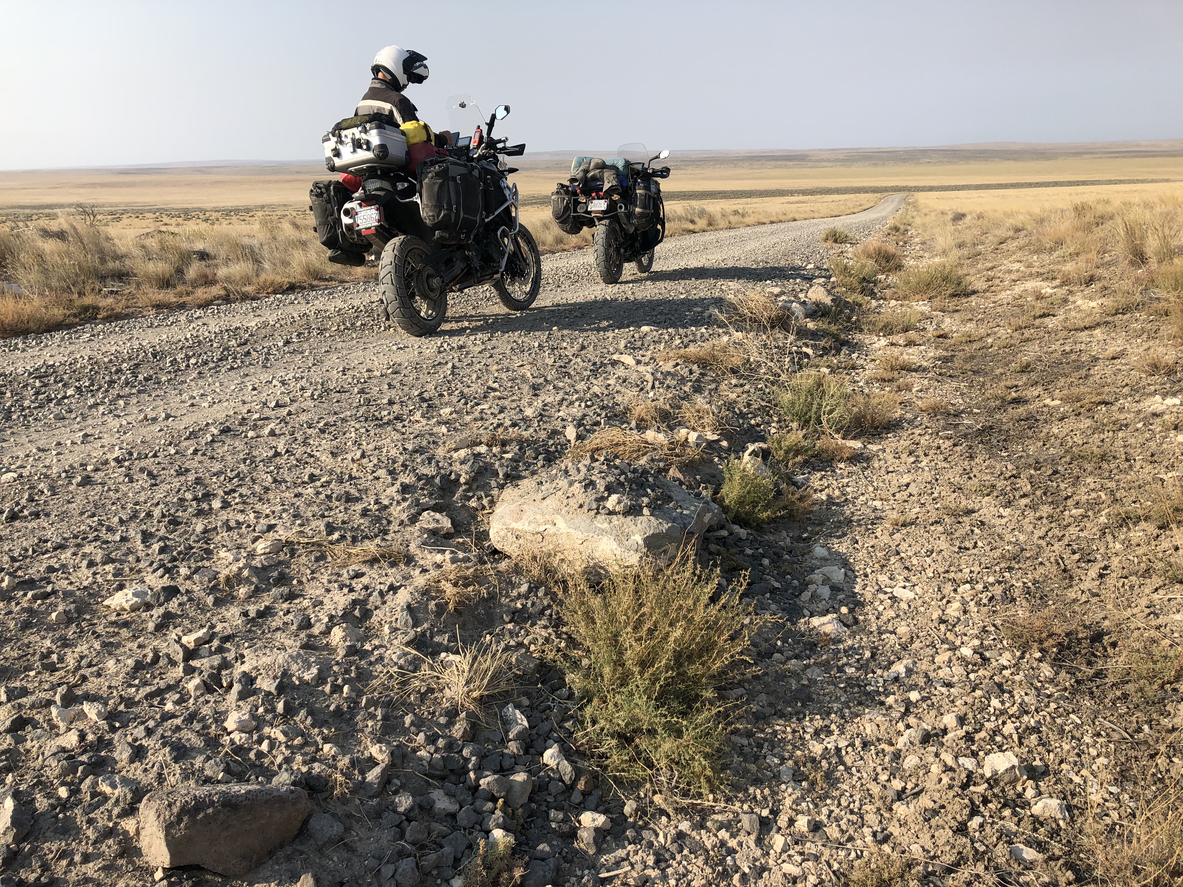 Here’s an example of a nice, smooth, flat stretch of the track. The dirt is dry and most of the rocks are embedded. On grades greater than about 8%, the track was, at times, severely gullied and covered with loose rock. That’s when it got technical, requiring standing on the pegs, maintaining momentum, and letting the bike lurch to and fro with knees bent. There was no way to stop for a photo under those conditions.