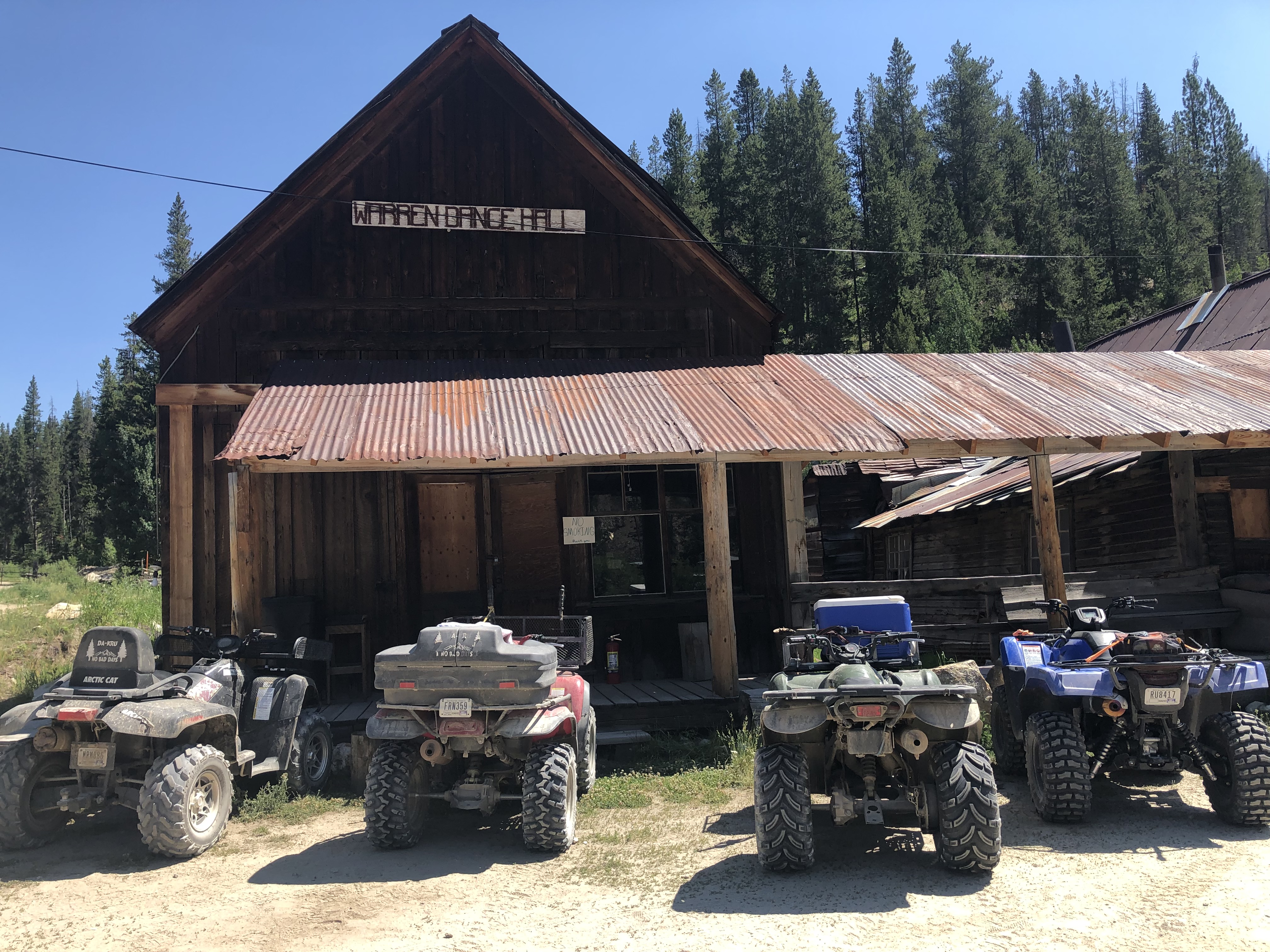 The village of Warren looked a bit like a ghost town, but there was gas available from an overhead tank if needed, dogs in the road, and a restaurant that was busy with local July 4th recreators. I had a nice Cobb Salad. The sign at the top of the building on the right (photo) says “Warren Dance Hall.” Those ATV riders were not dancing—just parked, hanging out, smokin’ an’ jokin’ in the 100-degree heat.
