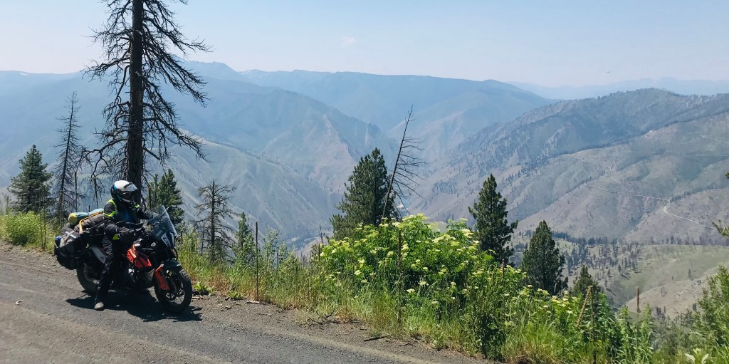 A small miracle allowed a weak cell phone signal out of the depths of the Idaho backcountry. “It was a pretty rough day,” I answered. “By the time I got up the mountain to the base of Burnt Knob Lookout, the halfway point on the Magruder Corridor, I was exhausted.” “The steep, 8-12% grades never let up and dodging the ruts and large rocks for miles while standing on my pegs was tiring.”