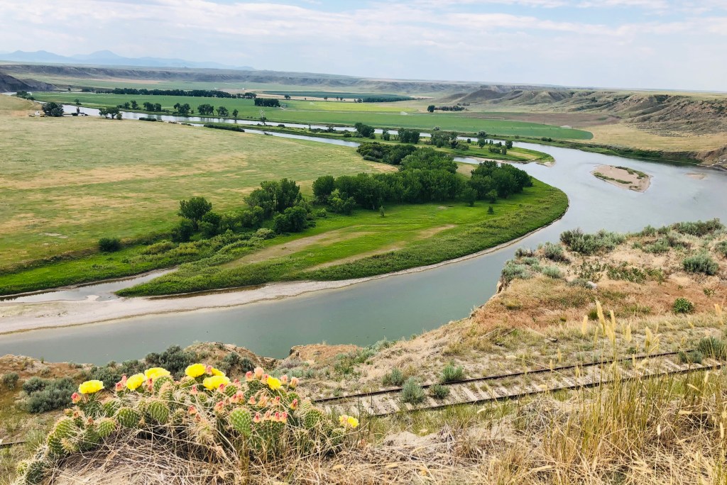 The Missouri River at an overlook off Route 89 between Havre and Great Falls Montana just north of Fort Benton. In mid-June, the grasses were still green and the rivers and streams were full. Ranchers were cutting and baling hay and irrigating young crops of corn and sugar beets. The humidity in the air was carrying sweet aromas of nature: drying hay, pollen, alfalfa blossoms, wetlands. It was a lovely, vibrant landscape.