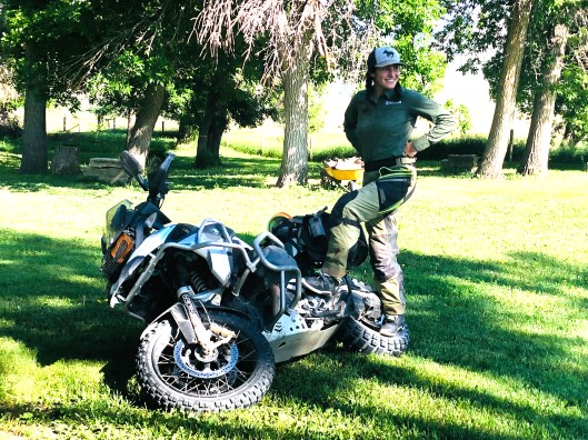 That petite, pony-tailed 20s-something young woman standing on the rear tire of her motorcycle is Cassie, our off-road training instructor. Jeff and I spent the first day of the rally as participants in an off-road riding course given by West38Moto located on the grounds of a beautiful Montana ranch west of Great Falls. Cassie, an off-road riding expert was our primary instructor. She is getting ready to demonstrate how to pick up a 550-pound motorcycle. Yes, she picked it up by herself. Why is picking up a heavy, dropped bike an essential skill for off-road riding? You guessed correctly.