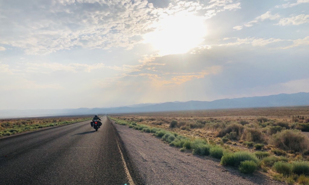 That’s Jeff under the early morning sun riding east of Eureka, NV, on Highway 50, “The Loneliest Road in the Country” according to the NV state highway map. From this point it would be another five days of travel through NV, UT, CO, KS, MO, IL, IN, and WV to reach our homes in VA.