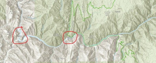 The green line on the map above is the BDR track (click on the map to expand it). Riding north to south we were nearly out of gas by the time we reached Riggins Hot Springs (red circle). One of our better decisions was to depart the track and head west along the Salmon River to the village of Riggins. It was getting late in the day anyway; we were hot and tired. The thoughts of a cold beer, a nice dinner, and a motel room flooded our meager brain cells—the ones that were still somewhat alert. But we were not too tired to suck in the beauty of the Salmon River Canyon along the 10-mile stretch of pavement to Riggins.