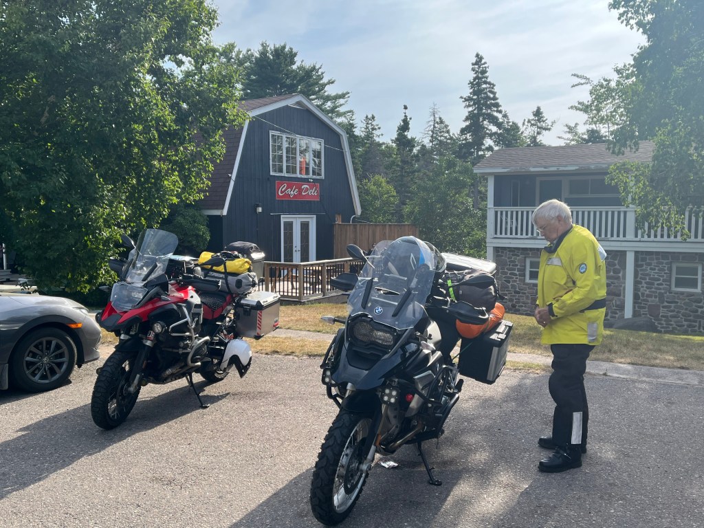 We ended our travel on the Cabot Trail at a nice Cafe Deli. It was fish cakes and beans for lunch—very traditional. We had just enough time to ride to North Sydney for the 3:30 PM check-in at the ferry terminal for the 17-hour, overnight sail to Newfoundland. The journey continues.