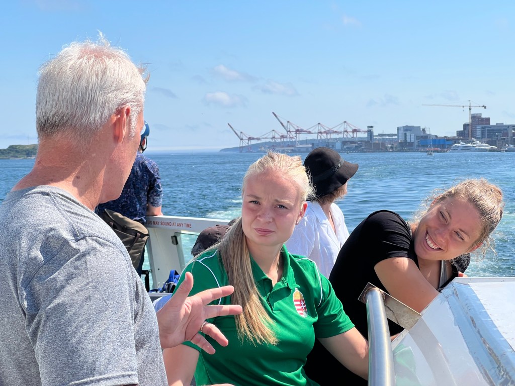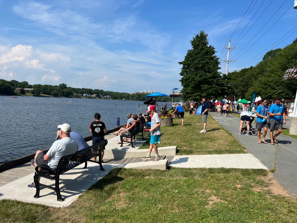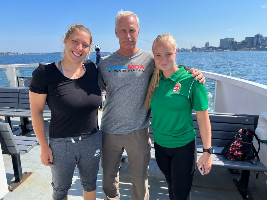 The pedestrian ferry across the bay to Dartmouth was free. Then it was a two-mile walk past Lake Banook to the hotel. Earlier during his morning walk, Jeff discovered that the 2022 World Canoe Races were ongoing on the Lake. We would walk right by this international festival. On the ferry next to us stood two young Hungarian women with race logo tee shirts. Ever curious, we struck up a conversation and learned through their heavily accented but good English that they were part of Team Hungary. We also learned much about the event and the specific race in which Laura and Vina’g would be competing. They had been racing canoes professionally for eight and eleven years, respectively. I couldn’t help but notice their muscular arms and broad shoulders; they would surely win their race.