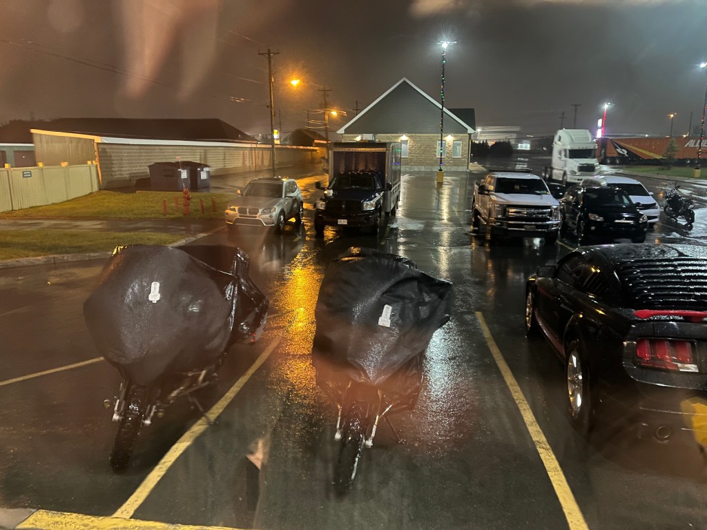 The view from the doorstep of our hotel room. It was still raining at the end of the day. Hoping for clear skies in the morning for our trip to Bonavista. (Photo by Jeff)