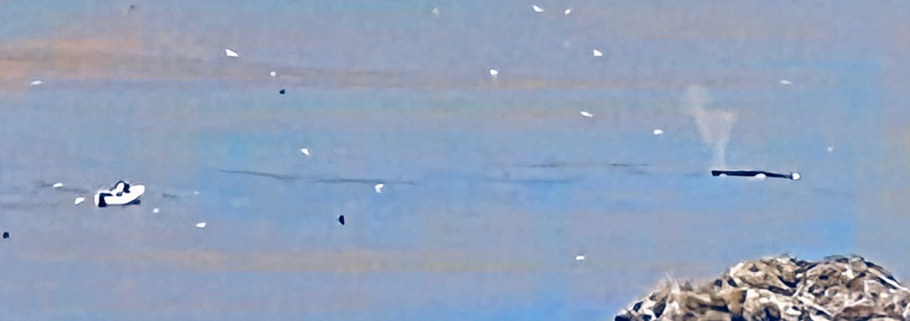 An iPhone photo shot from a long distance: A humpback whale is blowing (right side of image) as it traverses the Longpoint Lighthouse at Twillingate. That’s a boat on the left; the white spots are sea birds.
