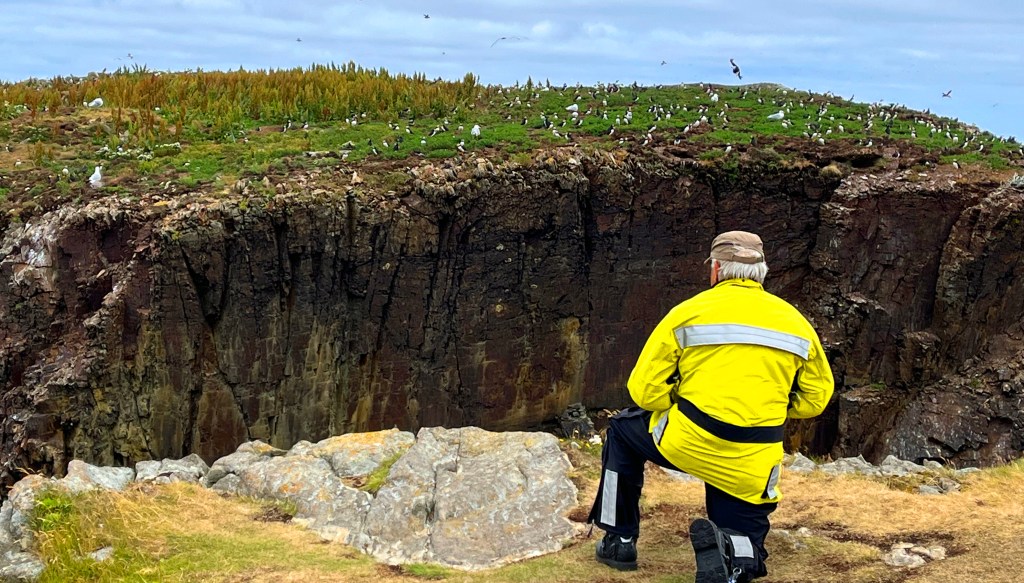 That’s me on the cliff edge getting in position for a puffin photo with my iPhone. (Photo by Jeff)